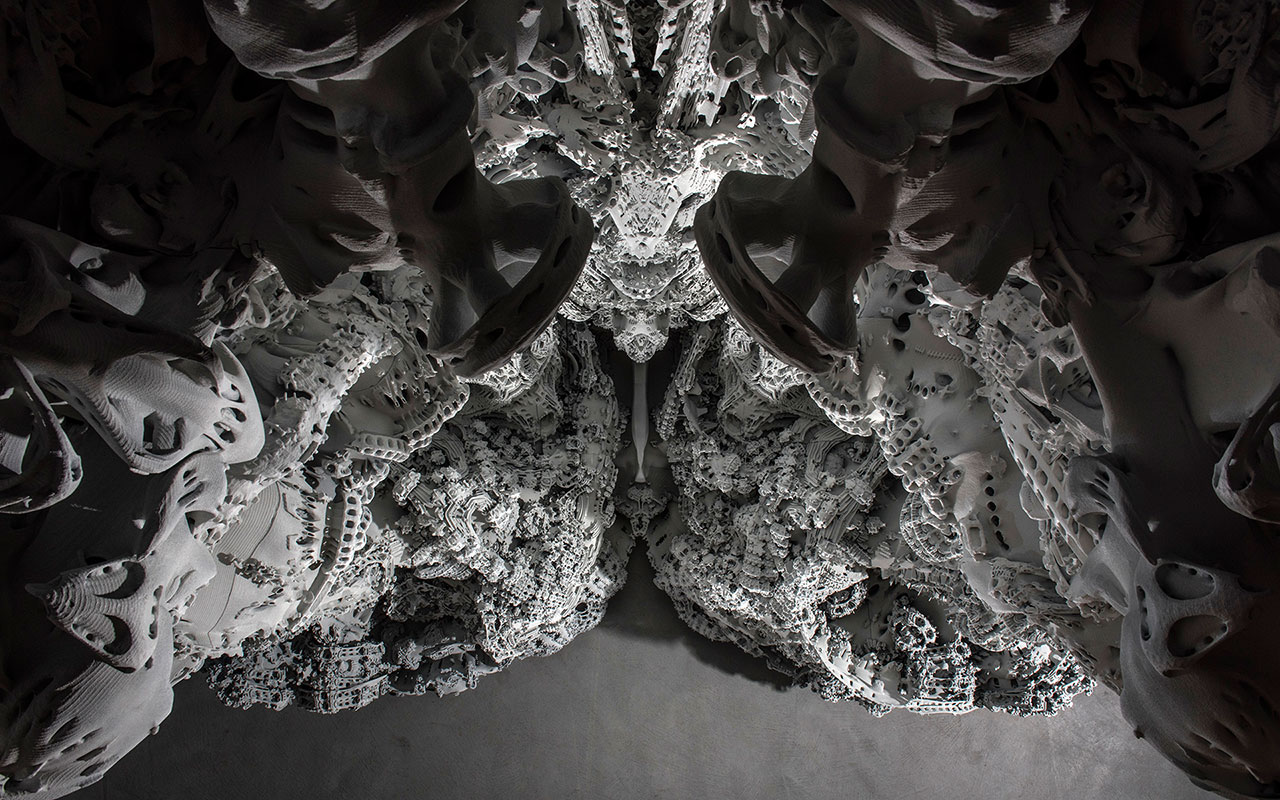 Digital Grotesque II, a full-scale 3D-printed grotto, premiered at the Centre Pompidou's Imprimer le monde exhibition and is part of the museum's permanent collection. This installation challenges conventional paradigms of design by exploring a novel collaboration between designer and computational system.