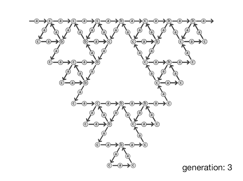 In the following example, the initial string a is rewritten three times to create abacabaabacabaacaba.